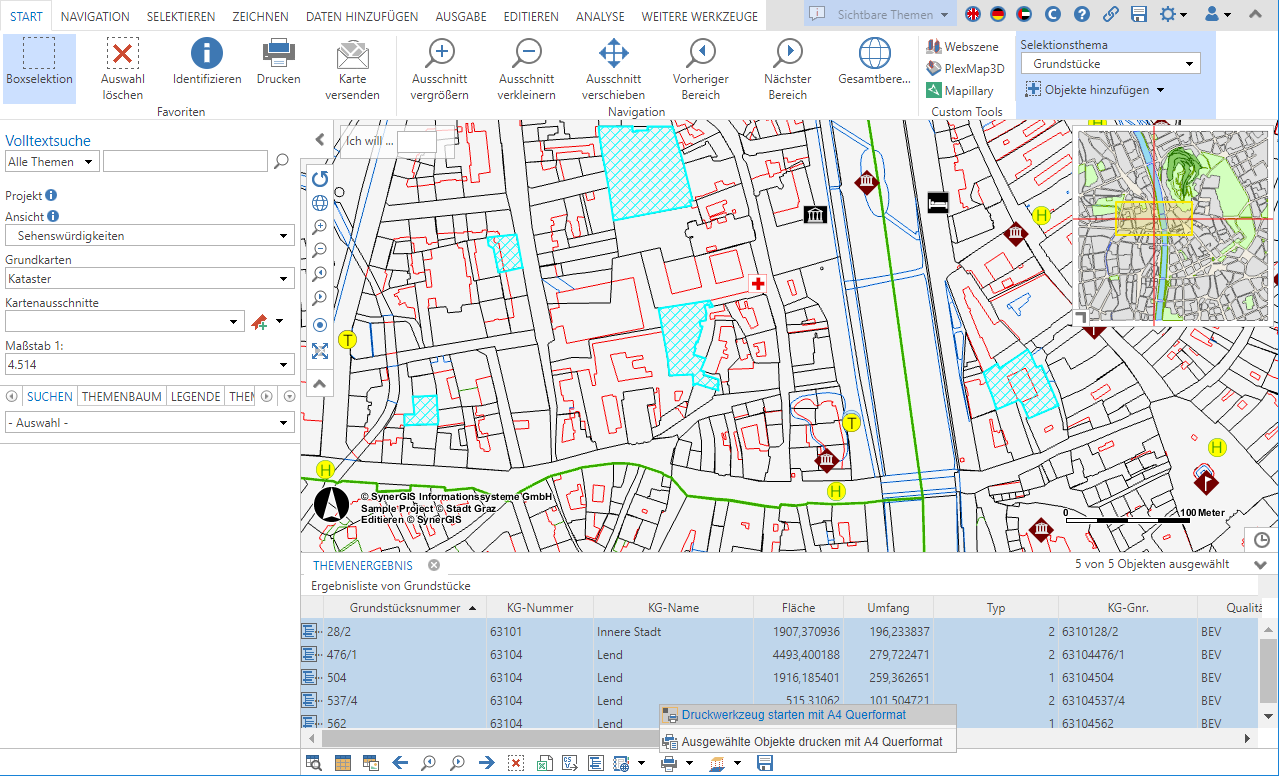 Diese Funktion ist nur für Druckvorlagen ohne Seriendruck verfügbar. Durch einen Rechtsklick auf die selektierten Objekte oder durch die Benutzung der Auswahlwertelistemenüs in der Werkzeugleiste des Themenergebnisses. Das Druckergebnis beinhaltet eine Einzelseite mit allen selektierten Objekten auf der Karte. |