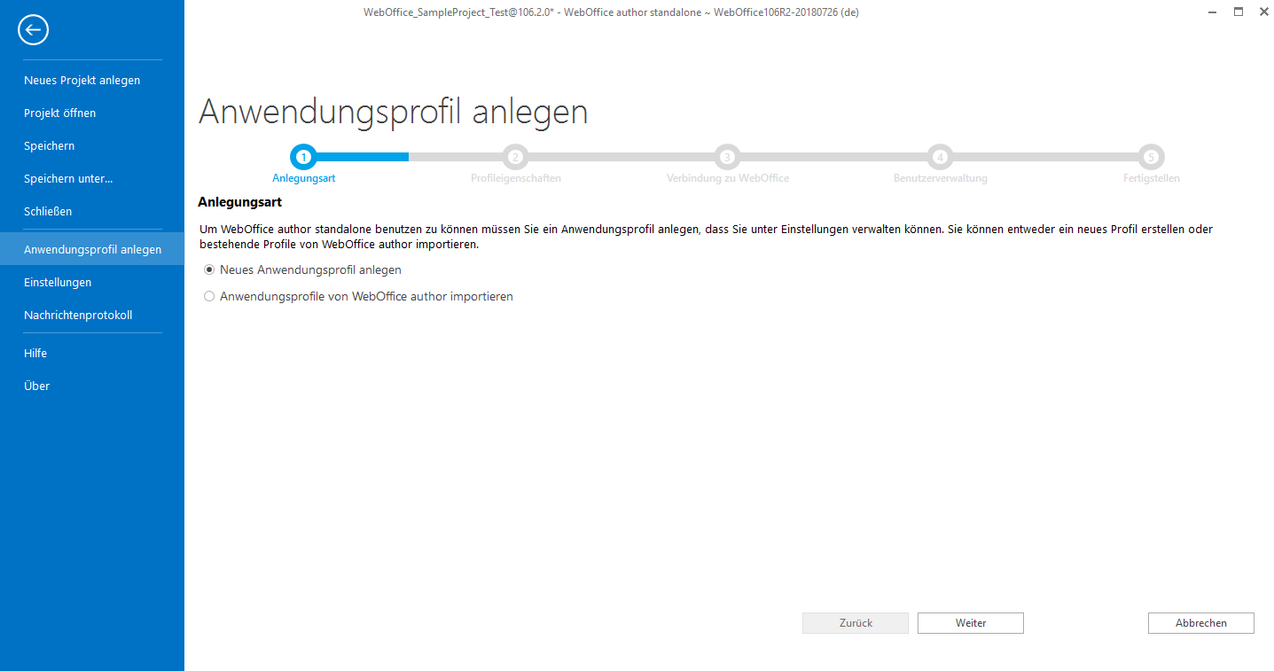 Dieser Wizard führt durch die erforderlichen Schritte, um ein neues Anwendungsprofil anzulegen. Dabei können zwei Arten der Neuanlegung unterschieden werden, die im ersten Schritt ausgewählt werden können und den weiteren Workflow des Wizards beeinflussen: